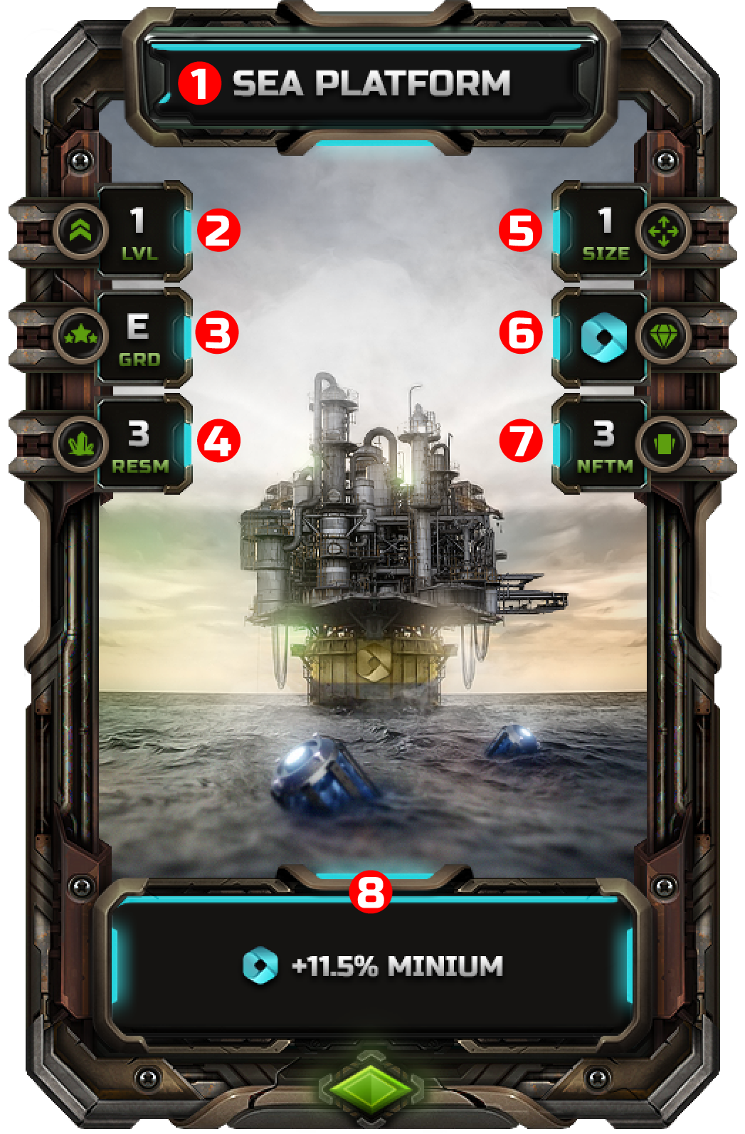 <table><thead><tr><th width="116.33333333333331" align="center">Number</th><th width="131" align="center">Name</th><th align="center">Description</th></tr></thead><tbody><tr><td align="center">1</td><td align="center">Name</td><td align="center">Indicates the name of the construction.</td></tr><tr><td align="center">2</td><td align="center">LVL</td><td align="center">Level (LVL). Each construction bears a level between 1 and 5. Once a construction reaches level 5, it is possible to improve its rarity.</td></tr><tr><td align="center">3</td><td align="center">GRD</td><td align="center">Grade (GRD), also called 'Rarity': Each construction bears a rarity Common (C) and Ultimate (U). Better rarity means better construction.</td></tr><tr><td align="center">4</td><td align="center">RESM</td><td align="center">RESource Mining (RESM): This value, generally between 3 (bad) and 15 (excellent), indicates how effective the construction is when it comes to resource extraction.</td></tr><tr><td align="center">5</td><td align="center">SIZE</td><td align="center">Size: Determines how many units can be placed on the construction to extract resources. When placed on a land, each construction occupies 1 slot but adds a given number of extra slots equal to the construction size.</td></tr><tr><td align="center">6</td><td align="center">ICON</td><td align="center">Indicates the main resource that the construction contains. Regardless of its level/rarity, each construction can only support 1 resource.</td></tr><tr><td align="center">7</td><td align="center">NFTM</td><td align="center">NFT Mining (NFTM): This value, generally between 3 (bad) and 15 (excellent), indicates how effective the construction is when it comes to NFT extraction.</td></tr><tr><td align="center">8</td><td align="center">BONUS</td><td align="center">Indicates how much the construction boosts the production of the land. This bonus is cumulative, meaning that if several constructions are placed on the same land, those bonuses add up.</td></tr></tbody></table>