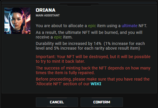 <figure><img src="https://2684424931-files.gitbook.io/~/files/v0/b/gitbook-x-prod.appspot.com/o/spaces%2FrquzxdBSgIxWQUoWlCwN%2Fuploads%2F6SsX4GNehFm7RomnIxMq%2Fgame.nftbattleminers.com_shadow_depths%20(31).png?alt=media&#x26;token=ef68dae5-71d5-456c-89d3-2880de1afd34" alt=""><figcaption><p>Allocate to clone confirmation window of an epic in game replica with a ultimate NFT</p></figcaption></figure>