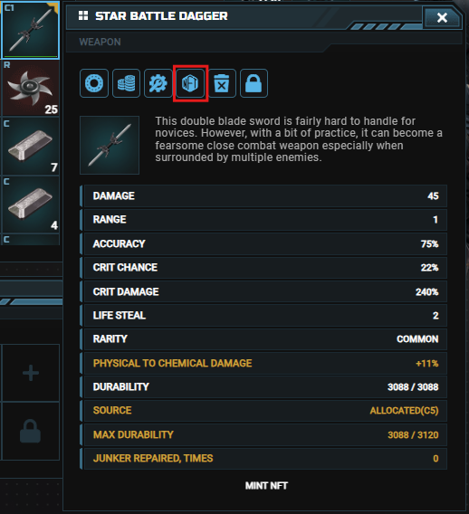 It is also possible to ask Junker to destroy the item to craft back the NFT. To do so, players can use the **Mint NFT** function located on the left menu of the item :