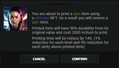 <figure><img src="https://2684424931-files.gitbook.io/~/files/v0/b/gitbook-x-prod.appspot.com/o/spaces%2FrquzxdBSgIxWQUoWlCwN%2Fuploads%2FHL3ASmKbCqfyJZf6uKEy%2Fgame.nftbattleminers.com_shadow_depths%20(32).png?alt=media&#x26;token=e033a7a8-f23b-4fd8-bf48-c5bbe89a11d4" alt=""><figcaption><p>Print a copy confirmation window of an epic in game replica using an ultimate NFT</p></figcaption></figure>