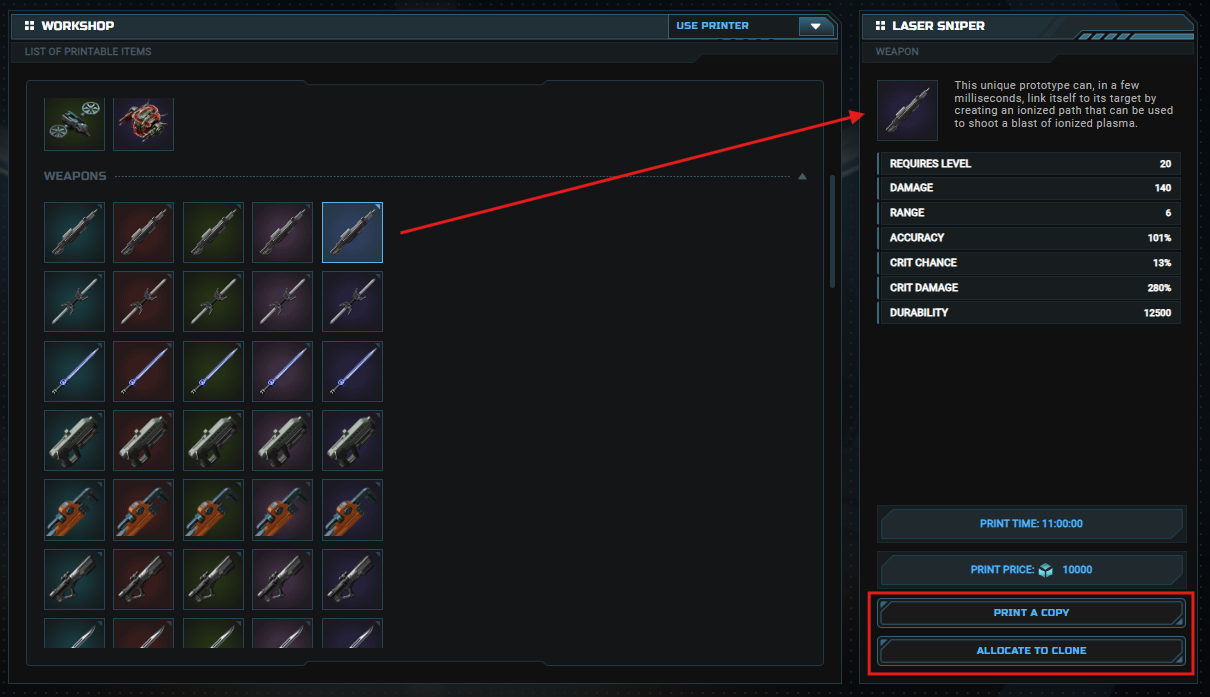 <figure><img src="https://2684424931-files.gitbook.io/~/files/v0/b/gitbook-x-prod.appspot.com/o/spaces%2FrquzxdBSgIxWQUoWlCwN%2Fuploads%2FSzZPG1uNgqgjVmi811MW%2Fimage.png?alt=media&#x26;token=66d71975-6268-4c4e-9768-b361785223f8" alt=""><figcaption><p>Laser Sniper Print a copy and Allocate to clone options from the Molecular Printer.</p></figcaption></figure>
