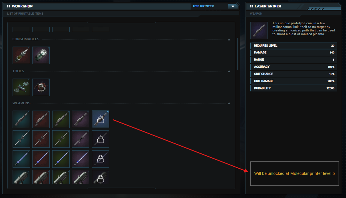 3\) As you go, you will see that you can't print or allocate any rarity of a replica by default. You will have to upgrade your[ Molecular Printer](https://nbmofficialwiki.gitbook.io/nbm-shadow-depths/overview/nft-battle-miners-official-wiki/vii-shadow-depths/spaceship/molecular-printer) to unlock them all progressively. In order to know what to do, click on the locked item and check the unlock requirement on the right panel.